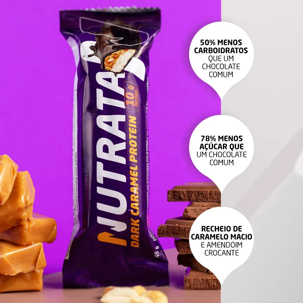 A Barra de Proteína Nutrata Caramel combina sabor e nutrição em uma experiência única, unindo chocolate, amendoim e caramelo em uma textura equilibrada. Possui 10 g de proteína por unidade e conta com um blend de proteínas de alto valor biológico, incluindo whey protein. Com recheio macio de caramelo, pedaços de amendoim crocante e cobertura de chocolate, é uma opção prática para quem busca sabor com mais equilíbrio no dia a dia.