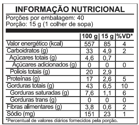 ALÉRGICOS: contém amendoim e derivados de leite e soja. Pode conter avelãs, castanha-do-pará, castanha-de-caju, aveia, ovos, macadâmias, nozes, pistaches e amêndoa.